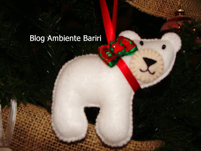 Confesso que até pensei em desistir no começo, porque nunca tinha trabalhado com feltro e demorou um pouco para pegar o jeito. Mas depois desse enrosco inicial foi bem fácil. Peguei os moldes na internet e comprei alguns materiais, como o feltro em algumas cores, enchimento, botões e fitas. Muita coisa reaproveitei: linhas em diversas cores, retalhos de tecido, fitas, botões, laços, miçangas, sininhos, cenourinhas de biscuit, etc. Até o papel mais grossinho usado para o molde foi reaproveitado de embalagem. Escolhi fazer alguns animais e objetos da temática natalina (rena, urso marrom, urso polar, boneco de neve, pinheiro de natal, biscoito de gengibre, sino, luva e bota).