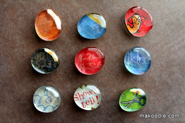 Ímãs para geladeira feitos com gemas de vidro. Pode-se usar fotos de família.